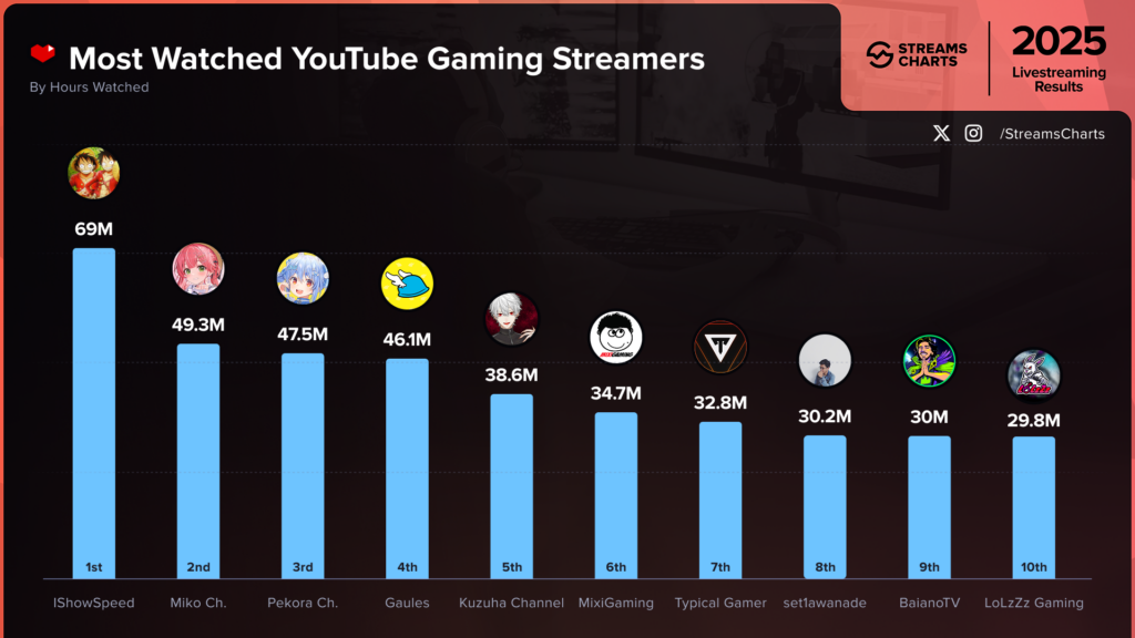 ※画像引用:https://streamscharts.com/news/top-youtube-gaming-streamers-2025